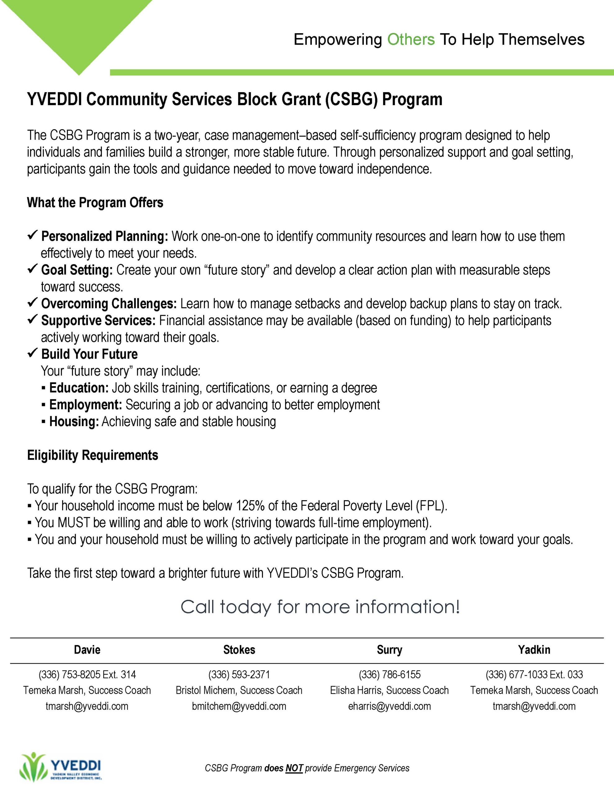 For more information, contact the CSBG Success Coach at the following locations: