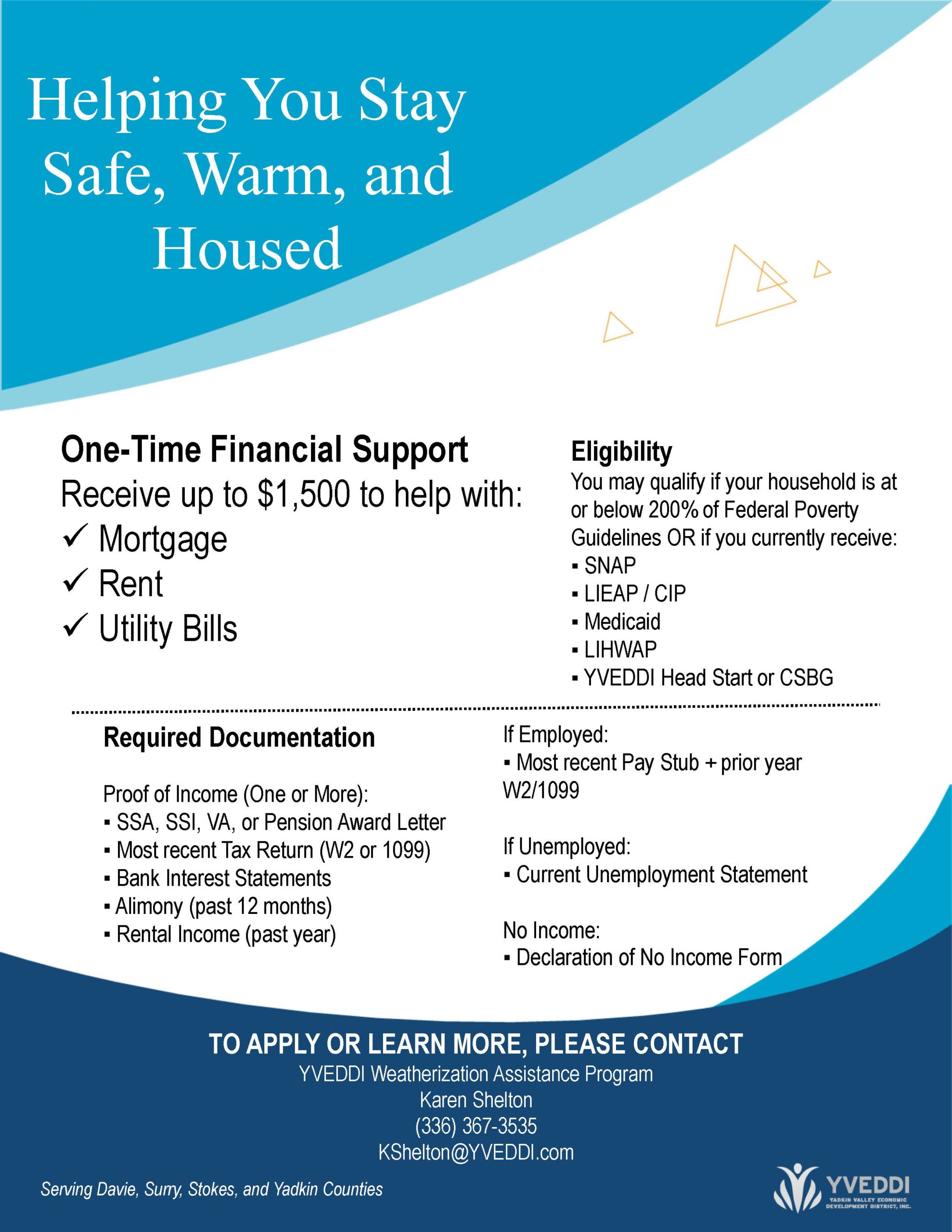 Participants must reside in Davie, Stokes, Surry, or Yadkin Counties to be eligible for the program.
