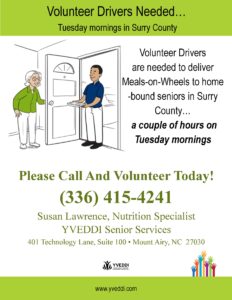 Funded by Federal Older Americans Act funds, state funds, local funds, United Fund of Surry County, Consumer Contributions, donations, and the Piedmont Triad Regional Council Area Agency on Aging.
